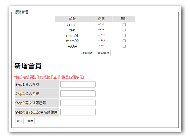 | <h1>新增會員</h1> <div style="color:red"> *請設定您要註冊的帳號及密碼(最長12個字元) </div> <table> <tr> <td class="clo">Step1:登入帳號</td> <td><input type="text" name="acc" id="acc"></td> </tr> <tr> <td class="clo">Step2:登入密碼</td> <td><input type="password" name="pw" id="pw"></td> </tr> <tr> <td class="clo">Step3:再次確認密碼</td> <td><input type="password" name="pw2" id="pw2"></td> </tr> <tr> <td class="clo">Step4:信箱(忘記密碼時使用)</td> <td><input type="text" name="email" id="email"></td> </tr> <tr> <td> <button onclick="reg()">註冊</button> <button onclick="clean()">清除</button></td> <td></td> </tr> </table> </div>
